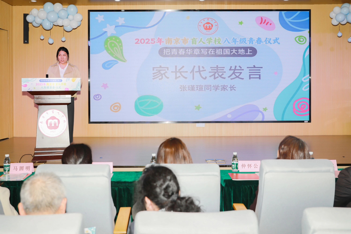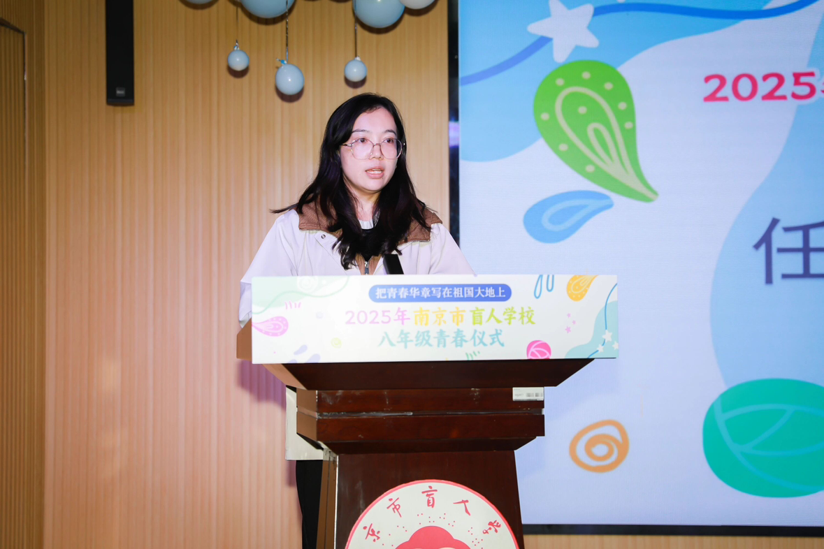2025年11月6日13时30分,南京市盲人学校“把青春华章写在祖国大地上”八年级青春仪式在学校报告厅举行。校党总支书记郑斌、校长任涛、副校长王吉星等校领导出席。校团委还特别邀请了南京审计大学金审学院审计学院院长仲怀公、党总支书记王亚娜以及吴学翠、马圆明、王雨竹等老师作为嘉宾,与八年级全体师生、家长共同见证这一青春盛典。