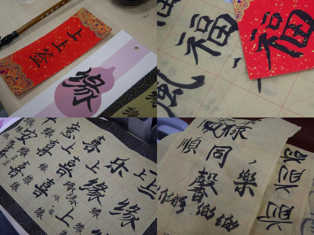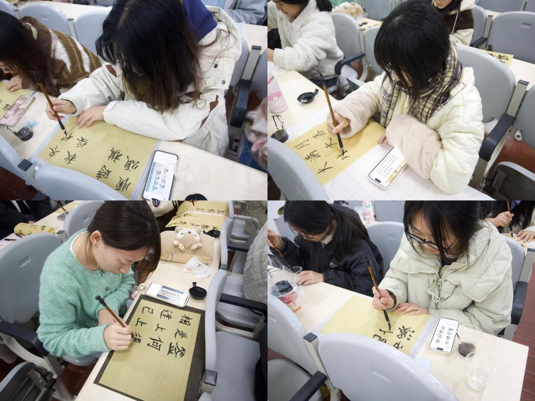 理论讲解与观摩之后,活动进入了最受期待的实践环节。在段老师的指导和鼓励下,到场师生纷纷拿起毛笔,亲身感受笔墨与宣纸的碰撞。一时间,教室墨香四溢,同学们凝神静气,在一笔一画的临摹与创作中,体会专注忘我的心流状态,切身感受书法带来的内心平静与精神愉悦。