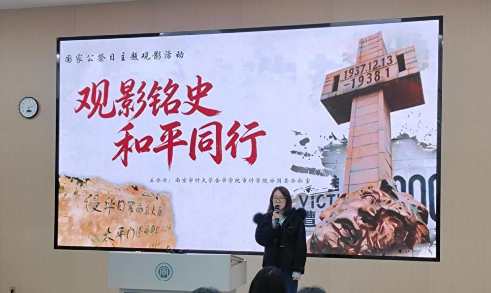 12月13日南京大屠杀死难者国家公祭日将至,为引导同学们回望历史、缅怀先烈,传承以爱国主义为核心的民族精神,审计学院分团委于12月10日在B南109教室开展了“观影铭史,和平同行”主题观影活动。我校团委代表吴沁洪老师,审计学院分团委段天彤老师与众多学子共同参与此次活动。