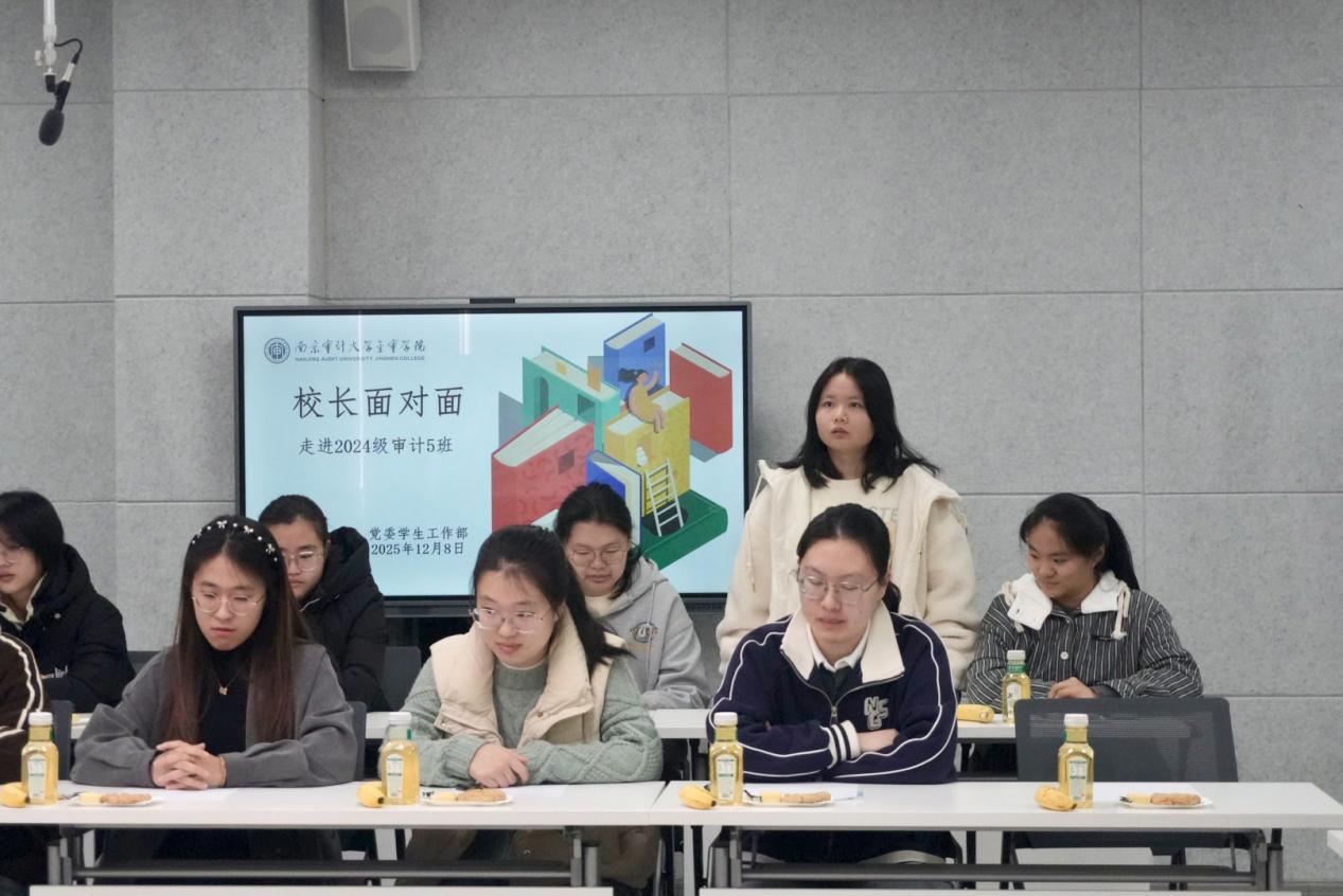 12月8日上午,我校校长俞安平走进2024级审计5班,与同学们开展了一场零距离、心贴心的交流座谈会。此次活动是学校构建畅通和谐师生沟通机制的重要举措,旨在回应学生关切,凝聚发展共识,助力学生成长成才。出席本次座谈会的领导还有校长助理孟琪璐、审计学院党总支书记王亚娜、学工处副处长刘颖。