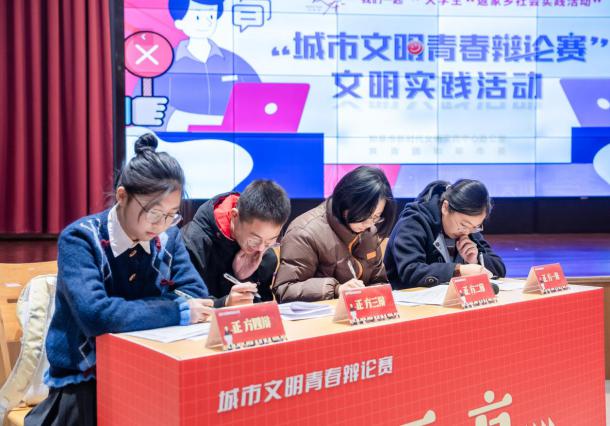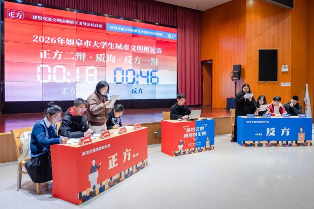 本次辩论赛以“建设城市交通文明,应更侧重于引导公民自觉还是强化政府规制”为辩题,我们青年学子围绕城市文明建设、交通治理、公共素养等主题展开思辨交流,以青春视角为家乡城市文明建设建言献策。历时两周的准备工作和线下模拟之后,2026年2月11日上午9:30,在江苏省如皋市爱心城市馆二楼,“城市文明青春辩论赛”实践活动正式开展