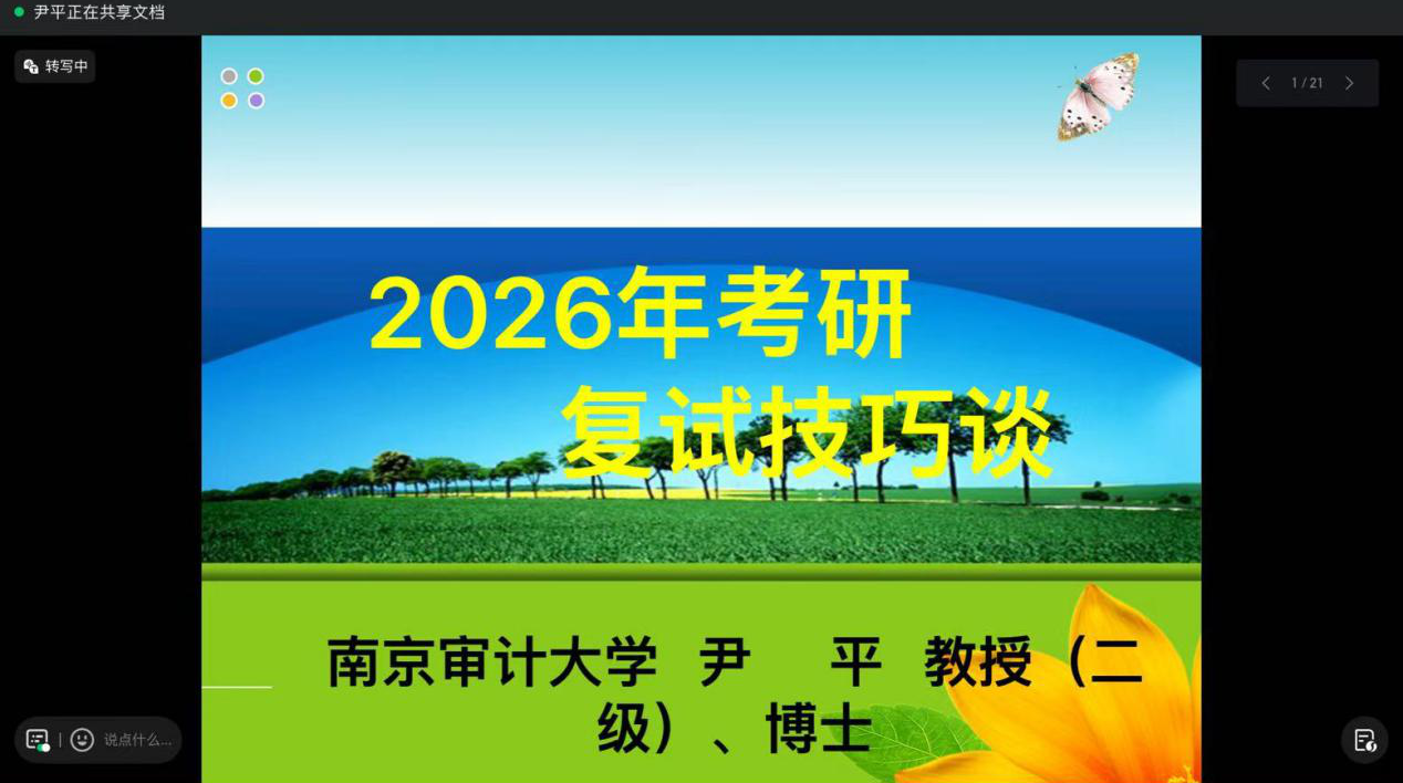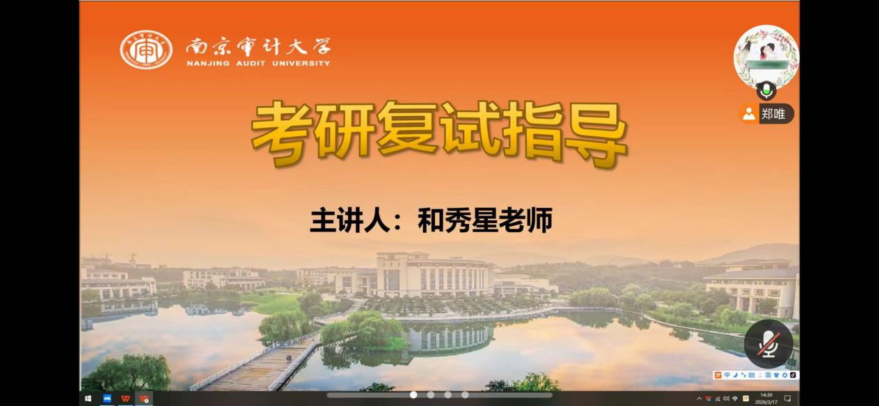 近日,为帮助2026届考研学子在复试阶段脱颖而出,我校成功举办了一场线上考研复试指导讲座。讲座邀请了我校副校长、博士生导师尹平教授,艺术设计学院党总支书记庄怀军,审计学院仲怀公院长、和秀星副院长四位名师,分别从复试策略、备考心态与专业知识等方面为同学们指点迷津。现场互动热烈,干货满满,学子们纷纷表示受益匪浅。