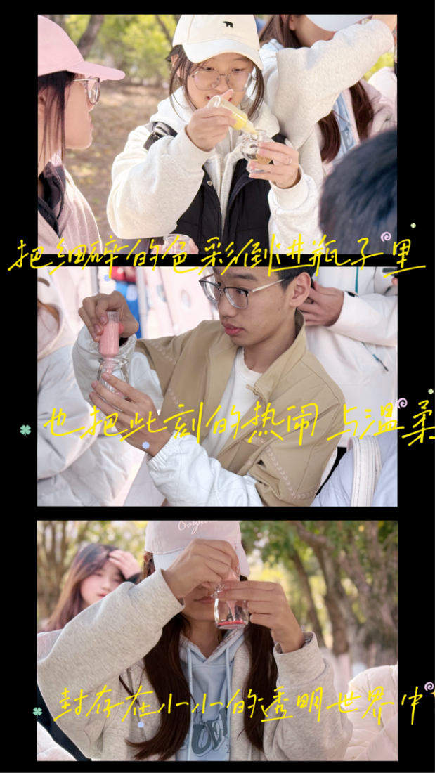 同学们手持工具,将不同颜色的彩砂通过漏斗精心堆叠入瓶中,创造出独一无二的“彩虹”层次,还有人巧妙地点缀上干花、亮片等小装饰。大家或全神贯注于自己的作品,或愉快地交流配色心得,在欢声笑语中享受着创作带来的纯粹快乐。