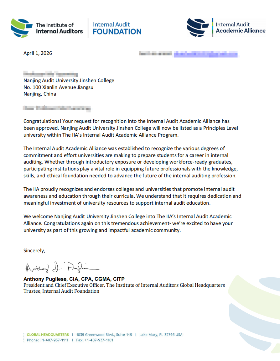 近日,国际内部审计师协会(IIA)全球总部传来喜讯:南京审计大学金审学院正式获批加入国际内部审计师协会学术联盟(InternalAudit Academic Alliance,简称IAAA)。