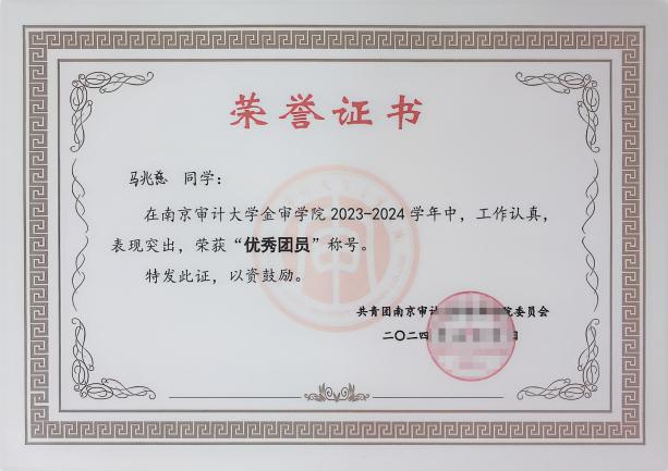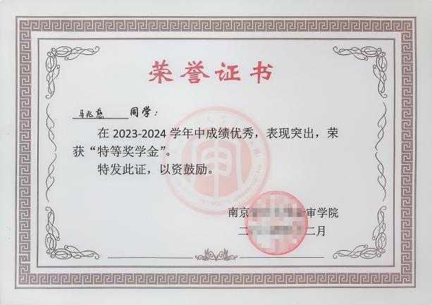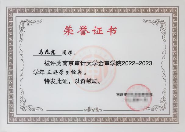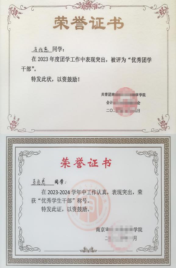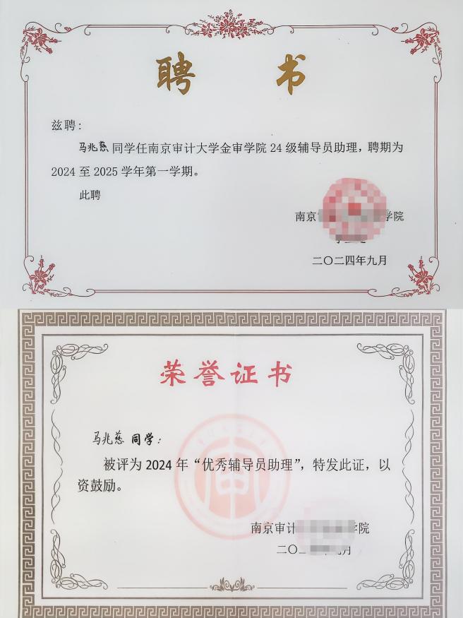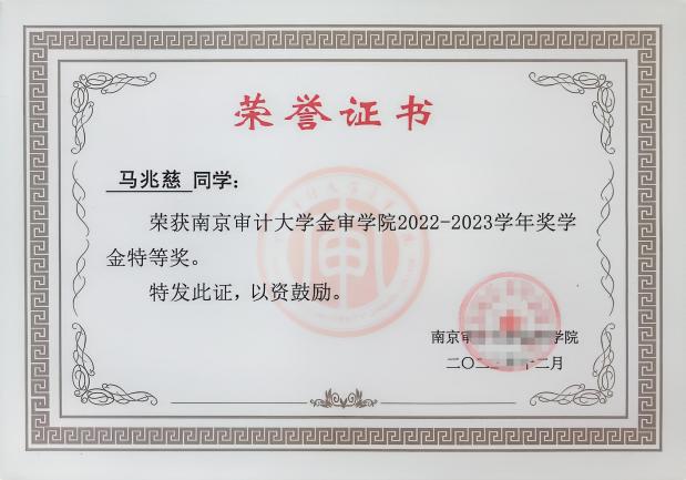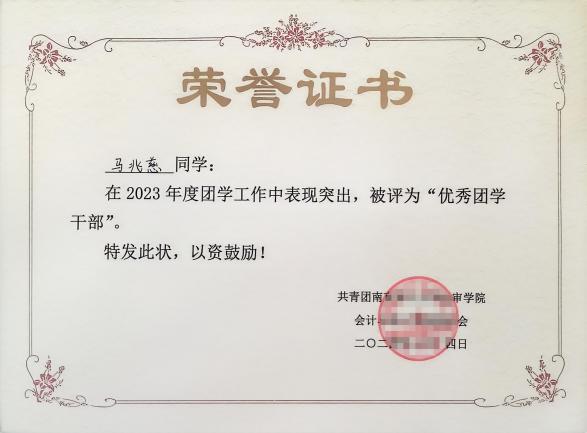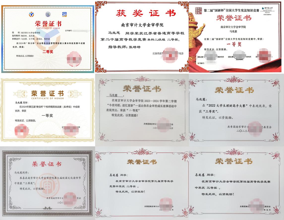 马兆慈,共青团员,审计学院2022级审计实验班学生。在今年的硕士研究生招生考试中,她以优异的成绩考取了西南政法大学。在校期间,马兆慈学习成绩优异,41门课程90+,绩点4.02,连续三年位列专业第一,曾获国家奖学金、特等奖学金、三好学生标兵、优秀团员等多项荣誉。此外,她积极参与各类竞赛,斩获国际级竞赛奖项1项、国家级竞赛奖项5项(含A类)、省级竞赛奖项2项,三年来累计获得各类荣誉奖项48余项。