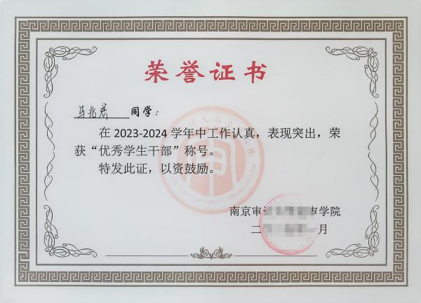 担任院学生会科研部部长期间,她举办了第八届“金审杯”辩论赛、第四届“角色扮演”益智游戏大赛、“扬五四精神,庆青春风采”通宵夜读活动等多项活动,被评为“优秀团学干部”和“优秀学生干部”。