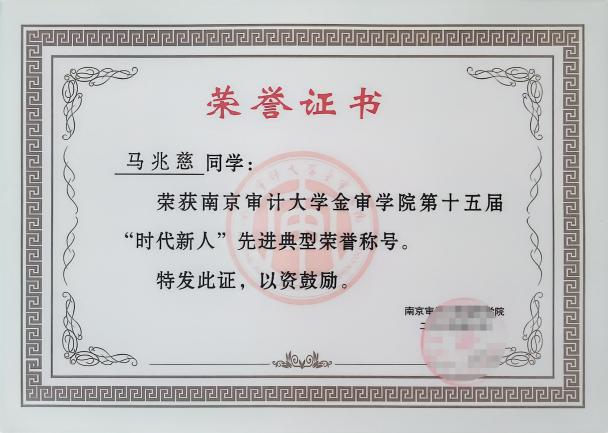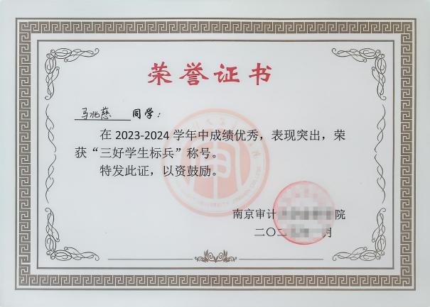 “学臻卓越,行践初心。”这句座右铭,照亮了马兆慈的大学四年。她从眺望远方的追梦人,变成了深耕脚下的实干者。审计专业课业繁重,她便把每一门课、每一个知识点都拆解、消化、再重构。她喜欢把事情做在时间前面——日计划、周安排、月目标,一事一项拆清楚,然后日复一日执行、复盘、查漏补缺。于是,那些早起的清晨和晚睡的灯火,悄悄连成了线——她的学业成绩,始终站在班级的最前面。大学期间加权平均成绩90.23分,总绩点4.0167,综测100分,连续两年专业排名第一。她还以第一作者身份在学术期刊发表论文一篇,用实际行动诠释了“笃学不倦”的箴言。